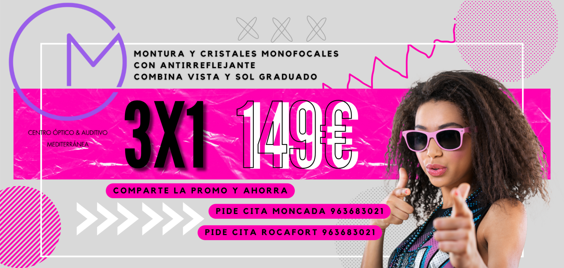 Tras la revisión en nuestro centro podrás aprovechar la oferta más económica que tenemos de 3 gafas por 149€. Esta oferta es combinable vista y sol y además el tercer par puedes compartirlo con quien tú quieras para que podáis compartir también el precio y que tu bolsillo llegue a más cosas al mes. Tenemos una gran oferta de monturas para que las combines con la graduación que necesitas. Todos los lentes de vista son con antirreflejante.