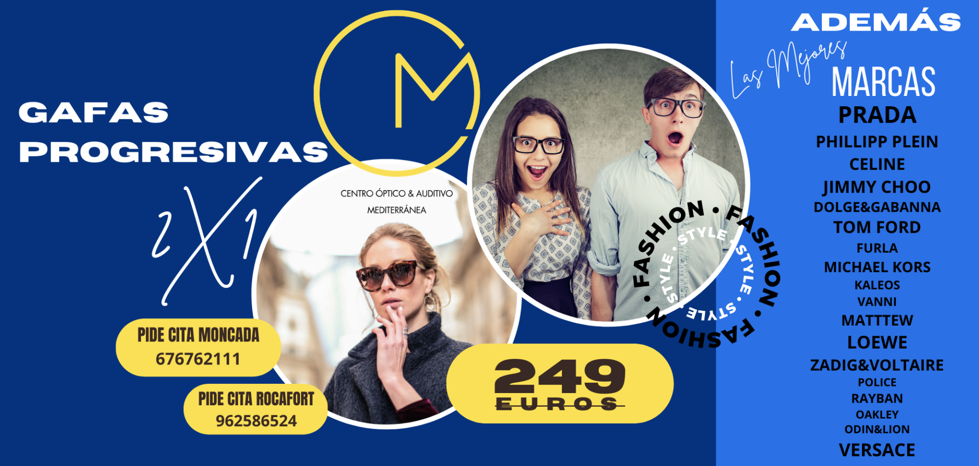 En el caso de que ya seas présbita o que necesites lentes progresivas debido a tus características visuales, también tenemos una oferta económica para vosotros. Consiste en dos gafas progresivas con antirreflejante por 249€, o si lo prefieres el segundo par puede ser con las mismas características pero de sol. En este caso la oferta es para una misma persona ambas gafas.
